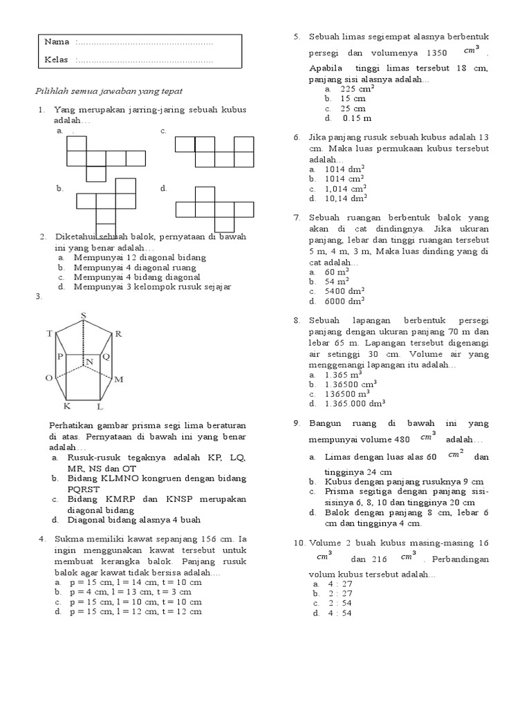 Sebuah prisma memiliki alas berbentuk persegi panjang dengan perbandingan ukuran panjang dan lebarnya adalah 3 : 5 contoh soal matematika smp kelas 9 tentang bangun datar bangun. Berikut mafia online sajikan daftar isi materi matematika smp kelas 8 viii semester ii genap. Kita akan belajar mengenai bangun ruang sisi datar. Pembuatan jaring jaring kubus dan balok kelas 5 sd it tunas mulia.
